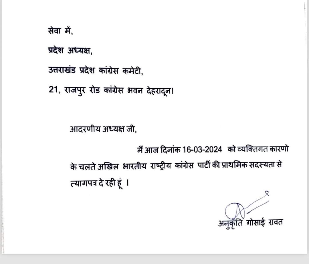देहरादून। लोकसभा चुनाव से पहले उत्तराखंड कांग्रेस से इस्तीफे थमने का नाम नहीं ले रहे हैं। अब एक और कांग्रेस नेता ने पार्टी को अलविदा कह दिया है। शनिवार को कांग्रेस नेता अनुकृति गुसाईं ने पार्टी से इस्तीफ़ा दे दिया है। अनुकृति ने व्यक्तिगत कारणों का हवाला देते हुए पार्टी की प्राथमिक सदस्यता से इस्तीफा दिया है। उन्होंने कांग्रेस अध्यक्ष करन महारा को अपना इस्तीफा भेज दिया है।