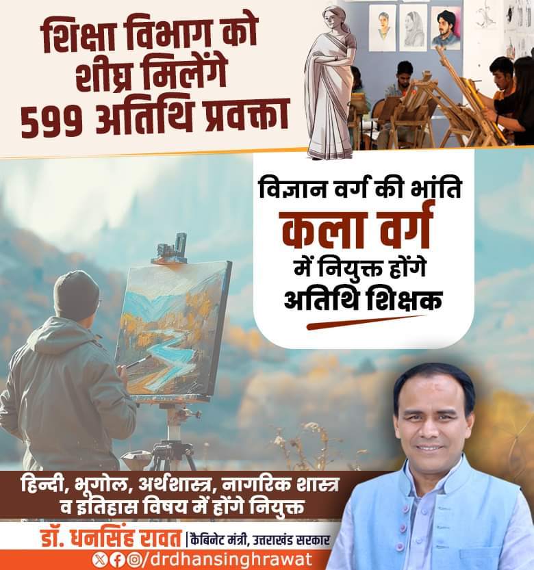 सूबे के विद्यालयी शिक्षा मंत्री डॉ. धन सिंह रावत ने बताया कि राज्य सरकार नई शिक्षा नीति-2020 के अनुरूप प्रदेश में शिक्षा व्यवस्था को सुदृढ़ करने में जुटी है। जिसके क्रम में सरकार ने प्रदेशभर के राजकीय इंटर कॉलेजों में विज्ञान विषयों की भांति अब कला वर्ग के विषयों में 599 अतिथि शिक्षकों की नियुक्ति करने का निर्णय लिया है। इस संबंध में शासन स्तर से शासनदेश जारी कर दिया गया है।