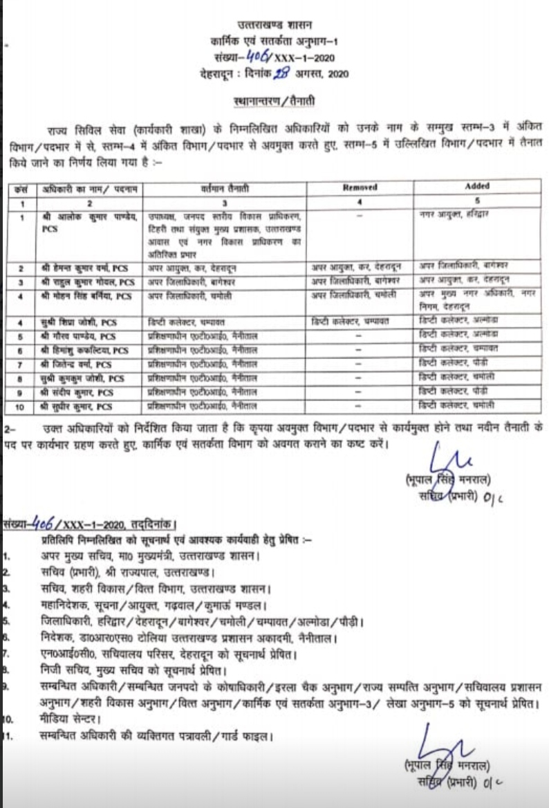 देहरादून: प्रदेश में अधिकारियों के स्थानांतरण लगातार जारी है। आज शासन ने 10 अन्य PCS अधिकारियों के तबादले किये। जिसमें पीसीएस अधिकारी आलोक कुमार पांडे को नगर आयुक्त हरिद्वार बनाया गया। हेमंत कुमार वर्मा को अपर जिलाधिकारी बागेश्वर, पीसीएस राहुल कुमार गोयल अपर आयुक्त कर देहरादून बनाये गए।