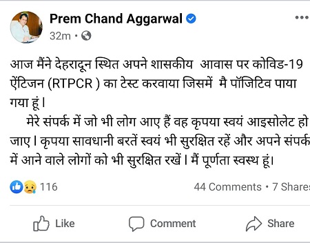 देहरादूनः उत्तराखंड में कोरोना का कहर लगातार बढ़ रहा है। कोरोना की चपेट में प्रदेश के विधानसभा अध्यक्ष प्रेम चंद अग्रवाल भी आ गये हैं। जबकि आगामी 23 तारीख से प्रदेश का मानसून सत्र शुरू होने वाला है। विधानसभा अध्यक्ष ने अपने फेसबुक वाॅल पर संदेश पोस्ट किया है कि वह कोरोना संक्रमण के शिकार हो गये हैं। उन्होंने लिखा है कि शासकीय आवास पर उन्होंने कोविड-19 ऐंटिजन का टेस्ट करवाया है जिसमें वह पाॅजिटिव पाये गये।