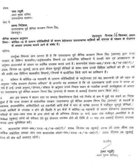 शासनादेश में यह भी स्पष्ट किया गया है पहले भूतपूर्व सैनिकों के आश्रितों को मौका दिया जायेगा और अगर उस पद पर कोई भूतपूर्व सैनिकों के आश्रित उपलब्ध न हो तभी उत्तराखंड के बेरोजगार युवा को मौका दिया जायेगा। जो कि 11 माह का अस्थाई रोजगार होगा।