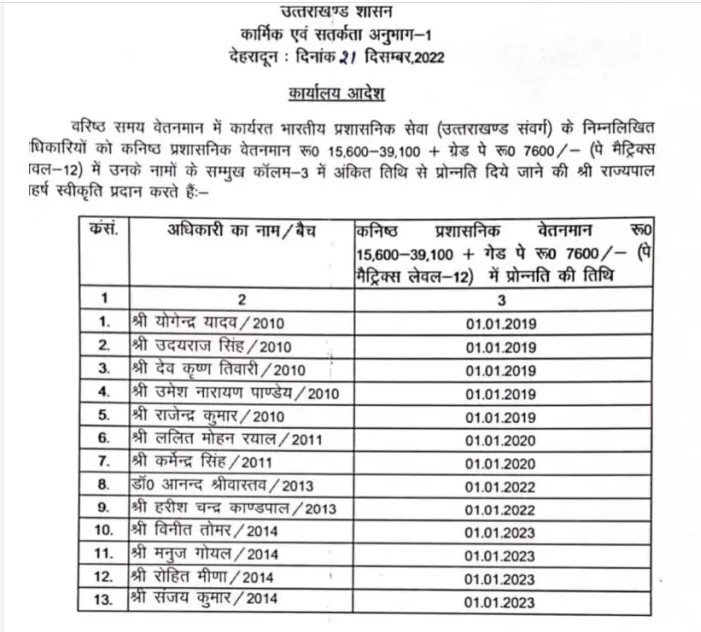 IAS PROMOTION LIST उत्तराखंड में शासन के द्वारा एक बार फिर से आईएएस अधिकारियों के तबादले की खबर सामने आ रही है जानकारी के अनुसार शासन के द्वारा कई बैच के 13 आईएएस अधिकारियों के प्रमोशन हुए हैं।आपको बता दें कि अभी बीते एक दिन पहले ही धामी सरकार ने ऎसी ही एक लिस्ट जारी की थी। उम्मीद की जा रही है कि आने वाले दिनों में बड़े पैमाने पर इन ब्यूरोक्रेट्स को सूबे में इधर से उधर कर नयी ज़िम्मेदारियाँ भी बांटी जा सकती है।