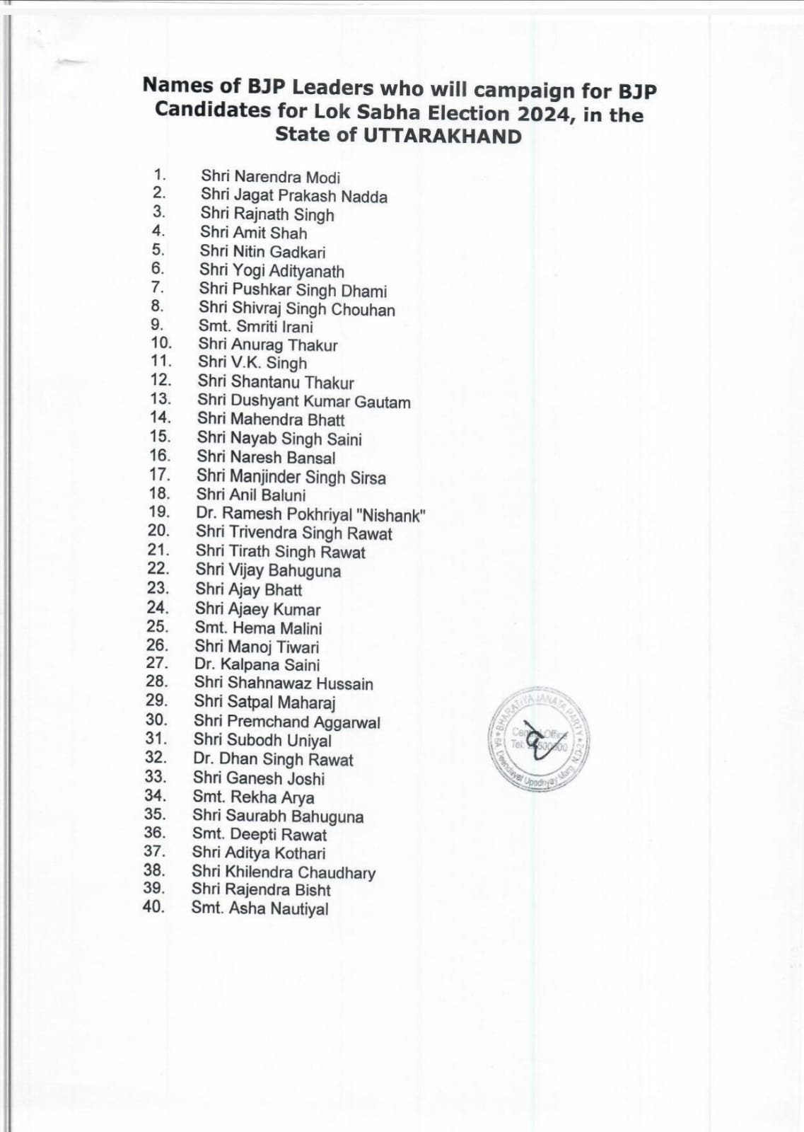 स्टार प्रचारकों की इस सूची के लिए संगठन ने केंद्रीय नेतृत्व से अनुरोध किया था। आज बुधवार को पार्टी की ओर से 40  स्टार प्रचारकों की सूची जारी की गई। राज्य की पांच लोकसभा सीटों पर रक्षा मंत्री राजनाथ सिंह, केंद्रीय मंत्री नितिन गडकरी, स्मृति ईरानी, मध्य प्रदेश के पूर्व मुख्यमंत्री शिवराज सिंह समेत कई केंद्रीय नेता आएंगे।