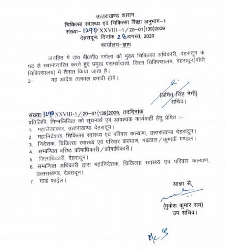 देहरादून: डॉ. बी.सी. रमोला को देहरादून के सीएमओ पद से हटा दिया गया है। स्वस्थ्य सचिव द्वारा जारी आदेश में डॉ रमोला को गांधी चिकित्सालय भेज दिया है। दरअसल डॉ रमोला के खिलाफ उन्हीं के कर्मचारियों ने मोर्चा खोल रखा था। उन पर कई आरोप लगे थे। पिछले दिनों गांधी नेत्र चिकित्सालय में मुख्यमंत्री के फिजिशियन और कोरोनेशन अस्पताल के वरिष्ठ चिकित्सक डॉक्टर एन.एस. बिष्ट ने डॉ बीसी रमोला पर गंभीर आरोप लगाए थे। साथ ही उन्होंने गांधी नेत्र चिकित्सालय में काली पट्टी पहन कर अपना विरोध भी प्रकट किया था। जिसके बाद शासन स्तर पर डॉ रमोला के खिलाफ कार्यवाही शुरू हो गई थी। वही डॉ रमोला को हटाने बाद अब देहरादून के नए सीएमओ डॉ अनूप कुमार डिमरी होंगे।