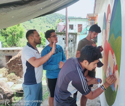 रूद्रप्रयागः रूद्रप्रयाग जनपद का अरखुण्ड गांव, वेगमती मंदाकिनी के दायें छोर पर टापू पर बसा आम पहाड़ी गांव। पहाड़ी ढ़लान पर छोटे-छोटे पर हरे-भरे खेत और बायीं ओर दिव्य हिमालय। जितना सुंदर इस गांव का भू-दृश्य उतने ही खुशमिज़ाज और मिलनसार यहां के रैवासी। इन दिनों अरखुण्ड बदला-बदला नजर आ रहा है। गांव की गलियों से लेकर घर की मुंडेरे किसी कैनवास से कम नहीं लग रही। कल्पनाओं से भरे सुंदर भित्तिचित्रों से अरखुण्ड किसी परीलोक जैसा लग रहा है। एक से बढ़कर एक सुंदर चित्रों से भरी गांव की दीवारे यहां के युवाओं के हुनर का प्रदर्शन कर रही हैं।